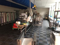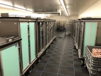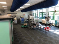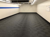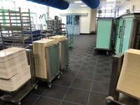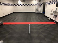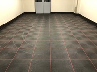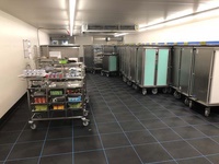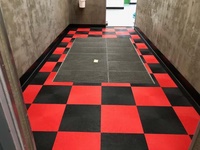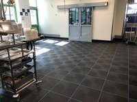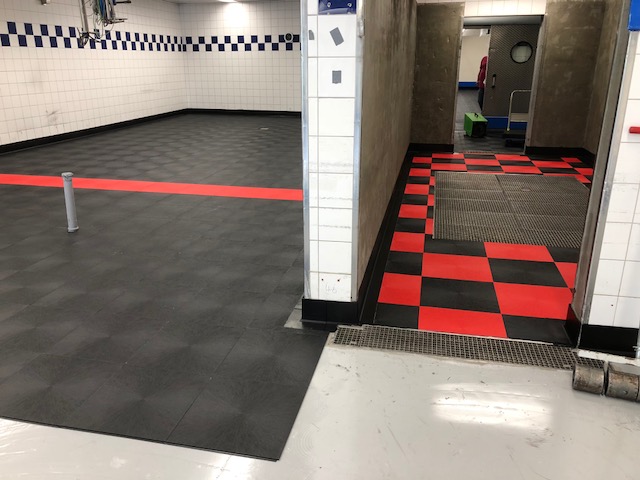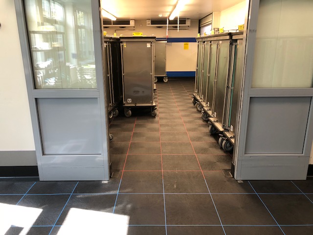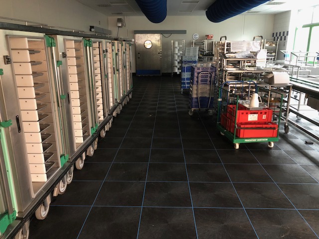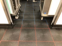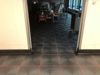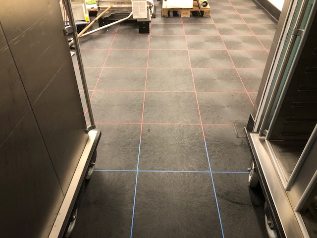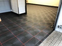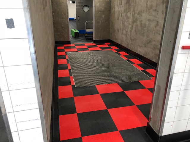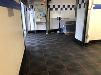 Industrieboden (Stufenfalzplatte, 6 mm) mit Rutschhemmung in den Farben Schwarz und Rot verlegt in einer Großküche.