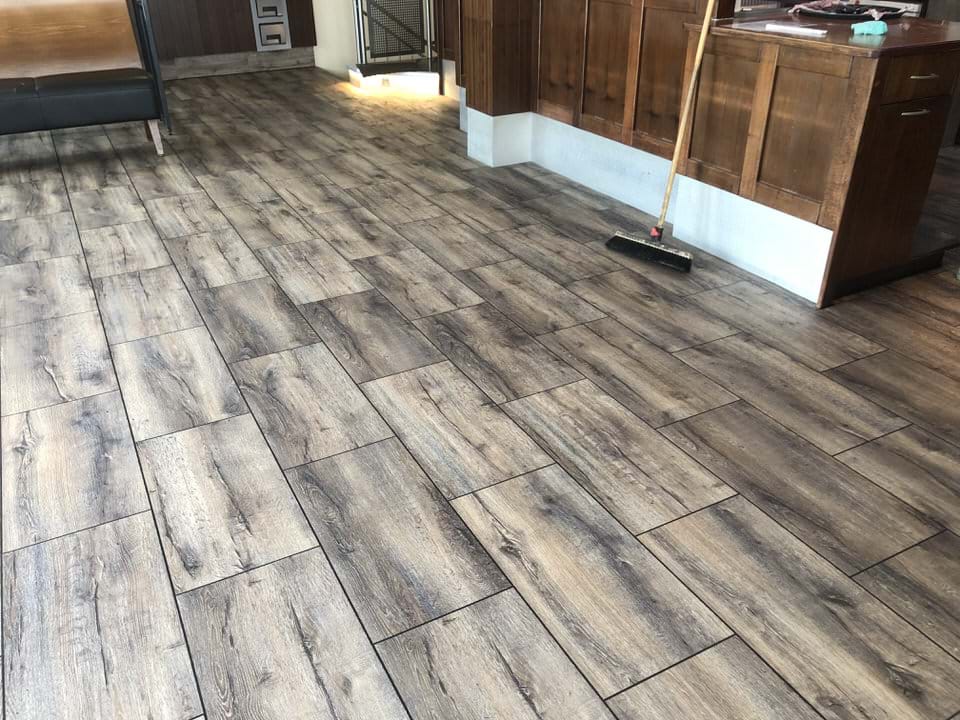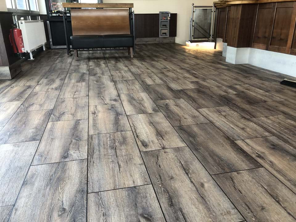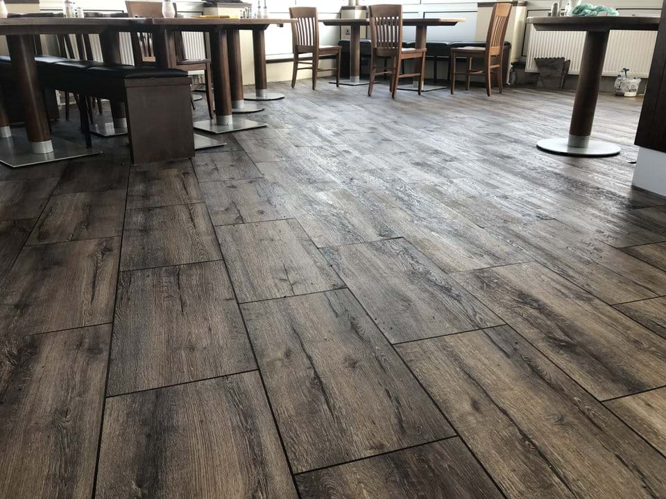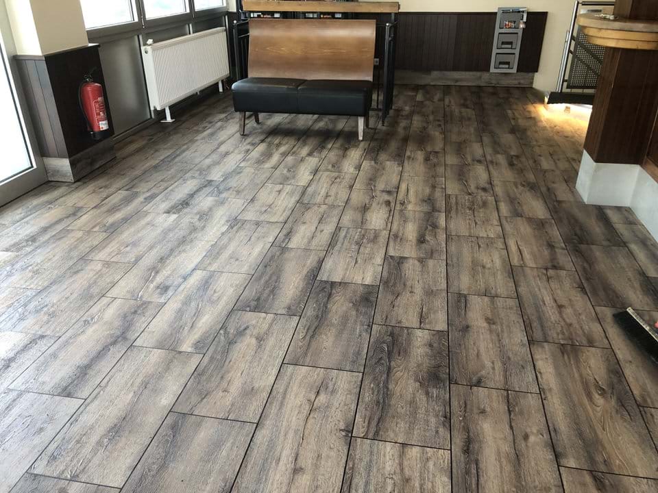 Die Bodensanierung mit unserem Designboden in Holzoptik mit schwarzen Fugen fand während der Öffnungszeiten im Restaurant "Route 61", direkt am Shell-Autohof (A61), Ausfahrt 14 (Mönchengladbach-Güdderath) statt. Der JB Designboden wurde dabei schwimmend auf dem bestehenden Fliesenboden verlegt.